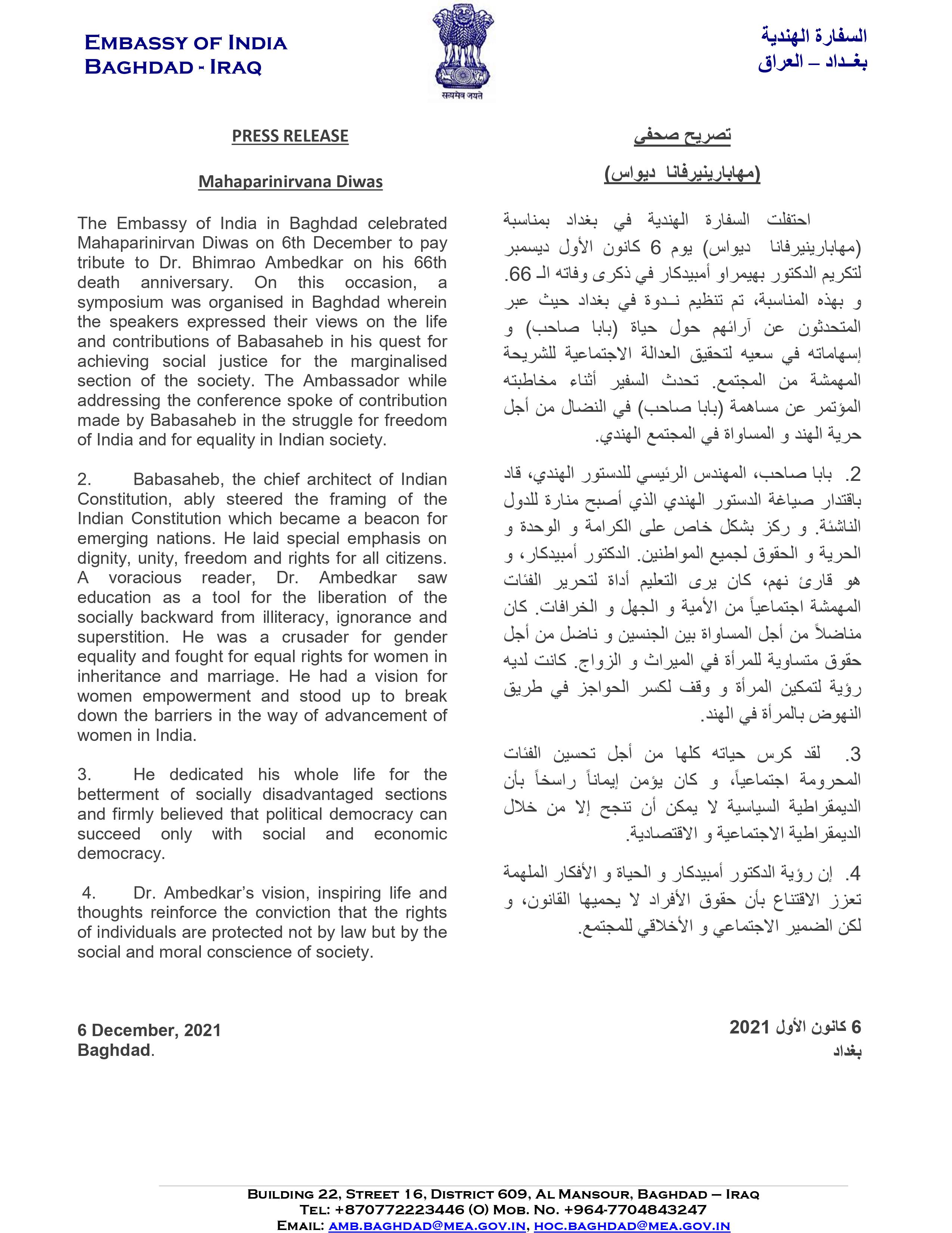 Press release on the occasion of Mahaparinirvan Diwas بيان صحفي بمناسبة (مهابارينيرفان ديواس)"