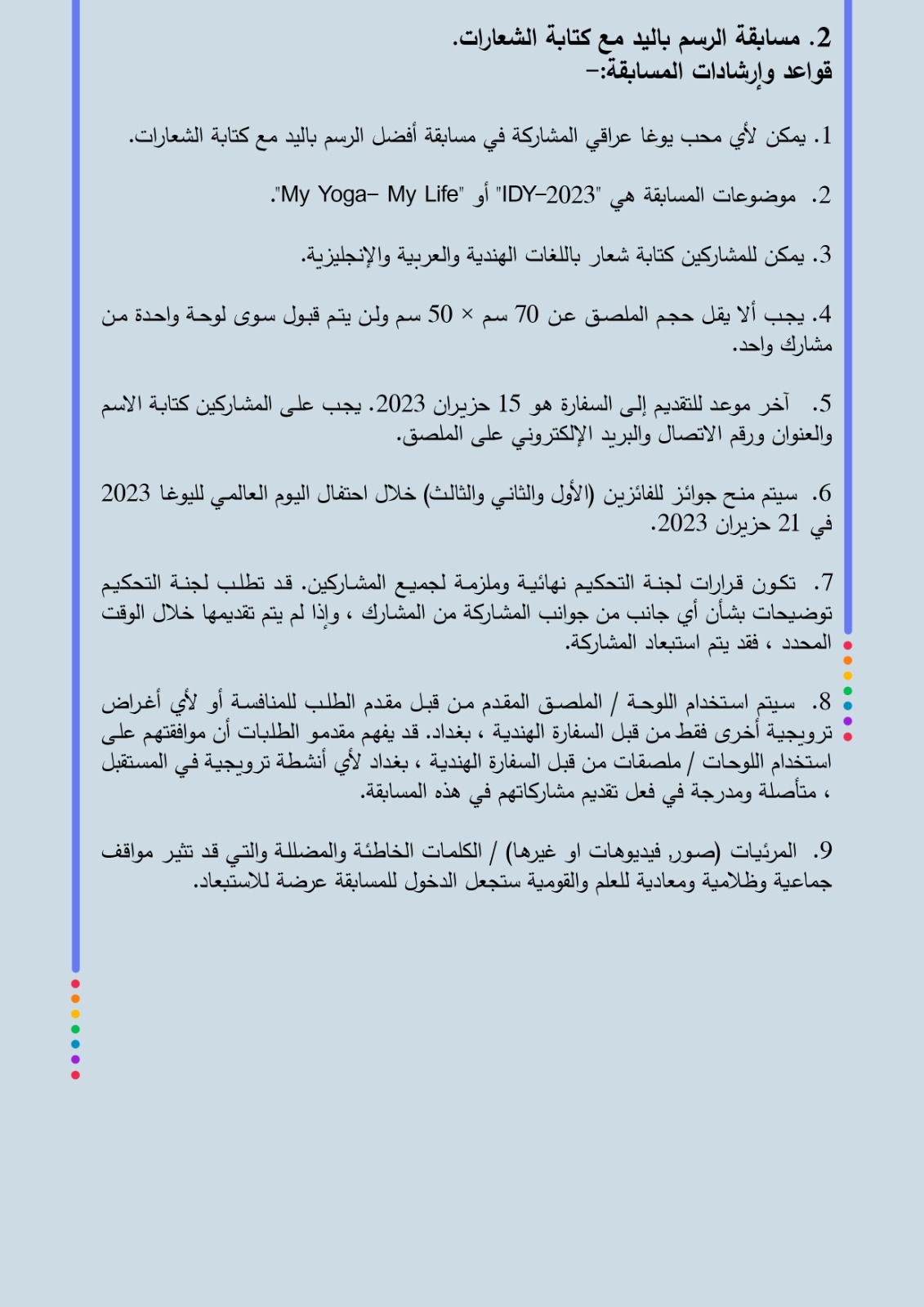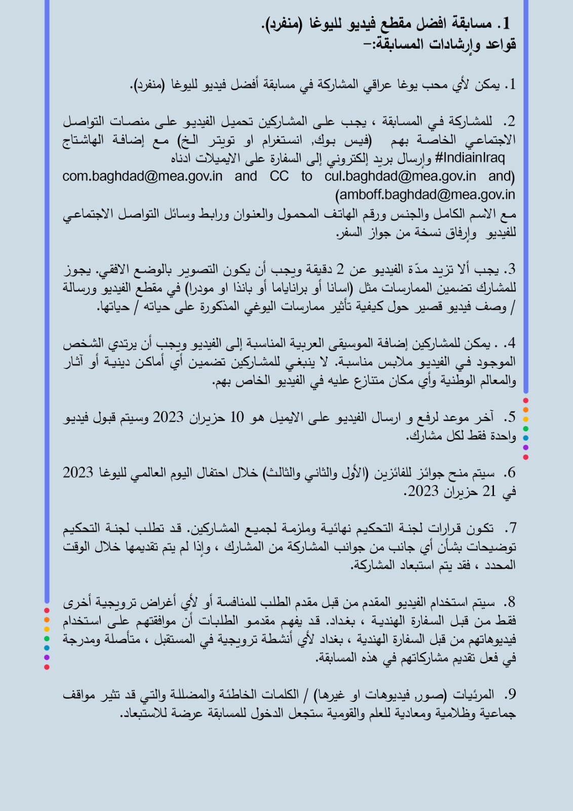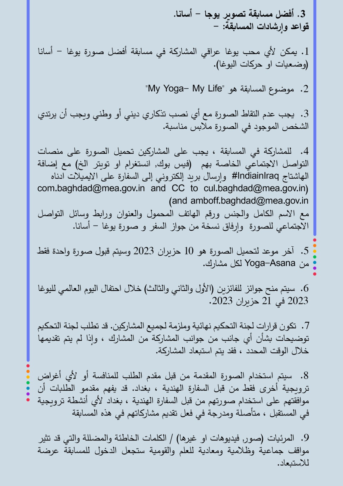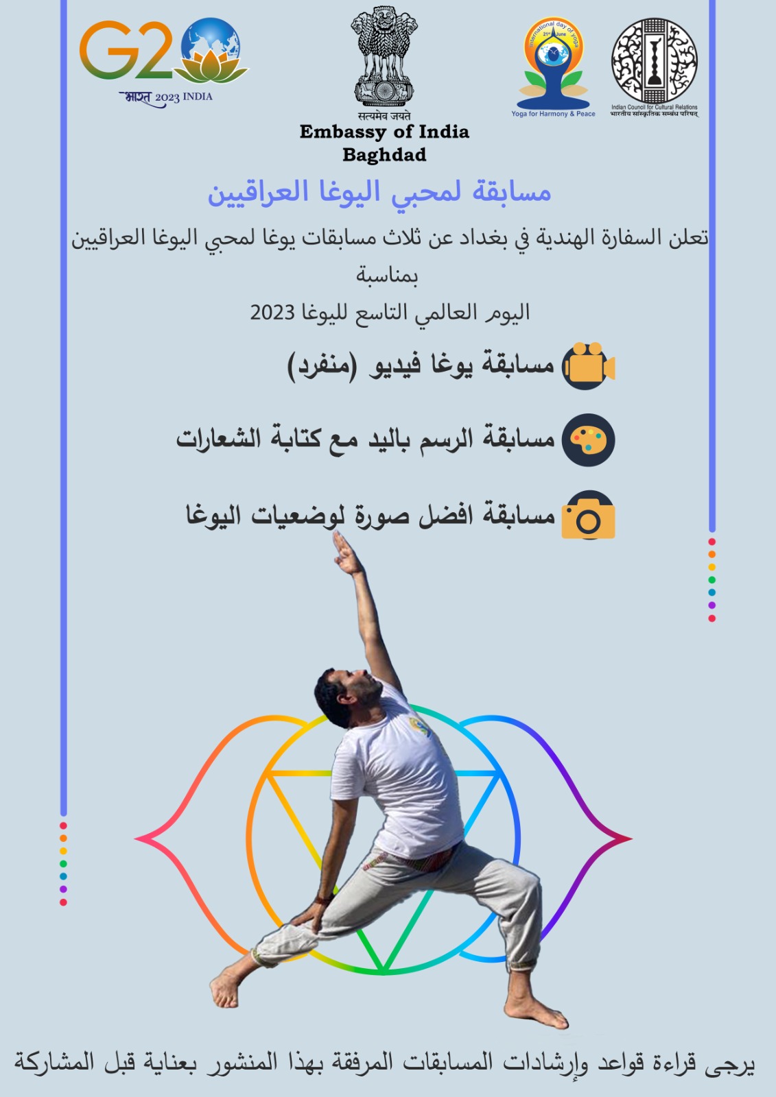 السفارة الهندية تعلن عن ثلاث مسابقات يوغا لعشاق اليوغا من المواطنين العراقيين بمناسبة اليوم العالمي التاسع لليوغا 2023
